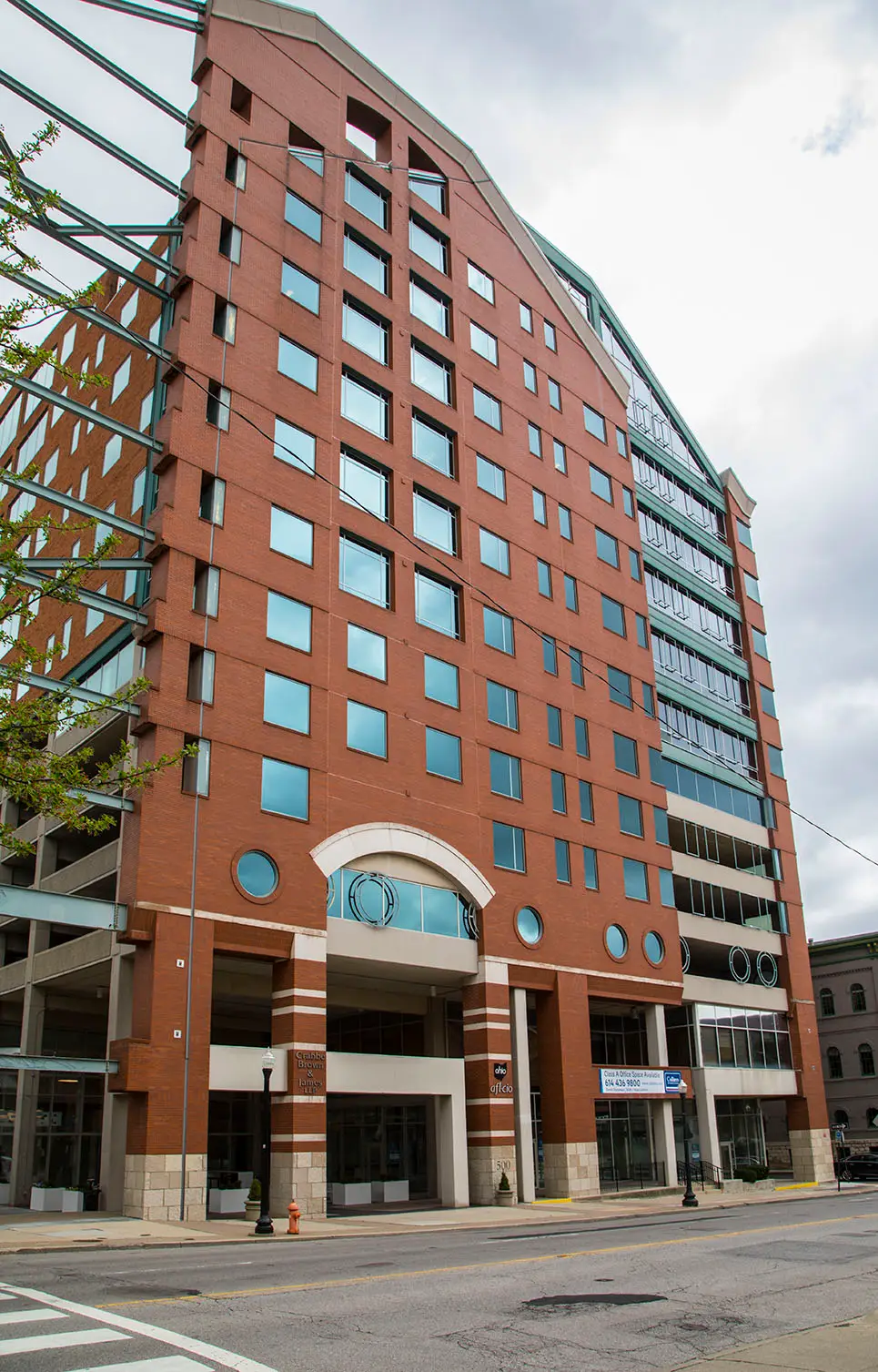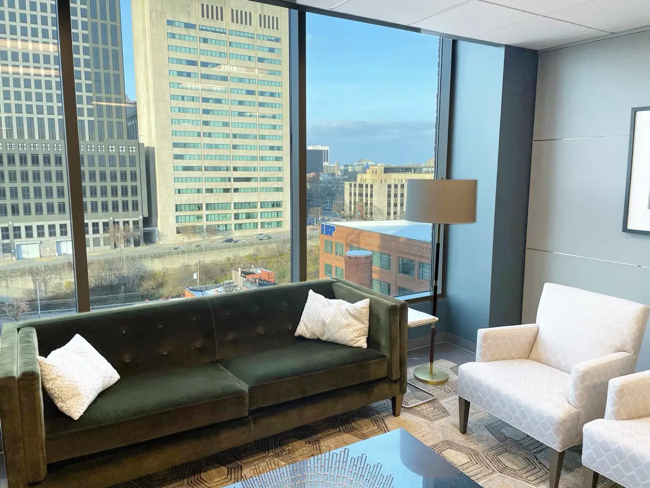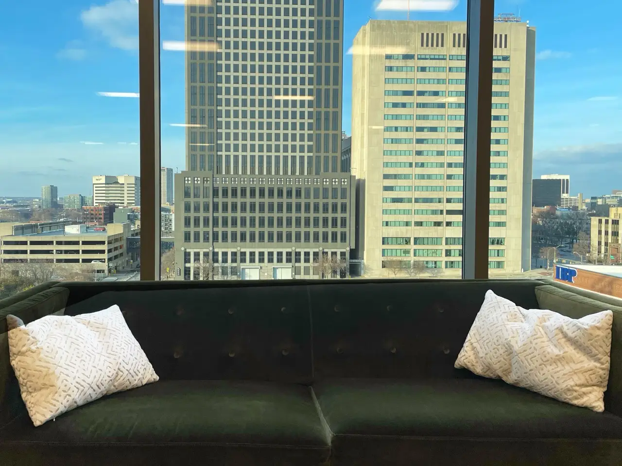 The corporate Woda Cooper Headquarters in Columbus, Ohio, features a welcoming & modern aesthetic with a 360° view of the Columbus, Ohio skyline, prioritizing soothing natural light.