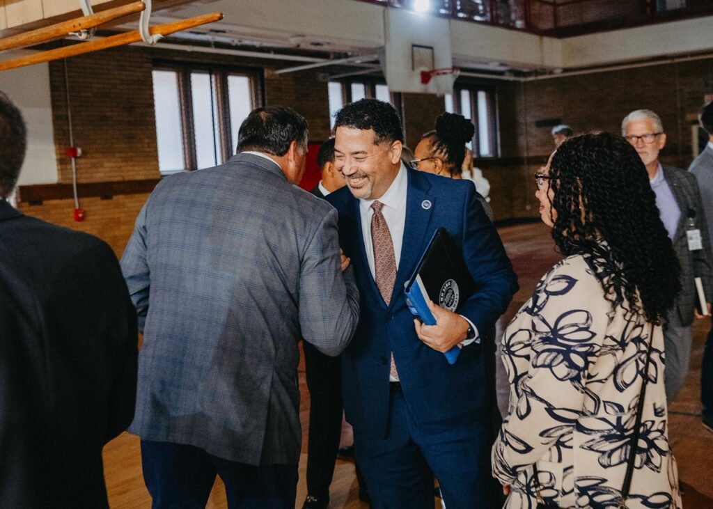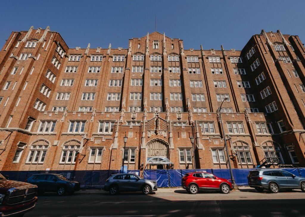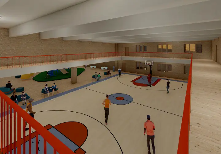 The building’s former gym has two full-sized basketball courts. One will be maintained for resident free play use, and the other will be converted into an indoor play area. In addition, there will be a community room with a kitchenette, a fitness room, bike storage, a pet care/wash room, a package room, and co-working space.