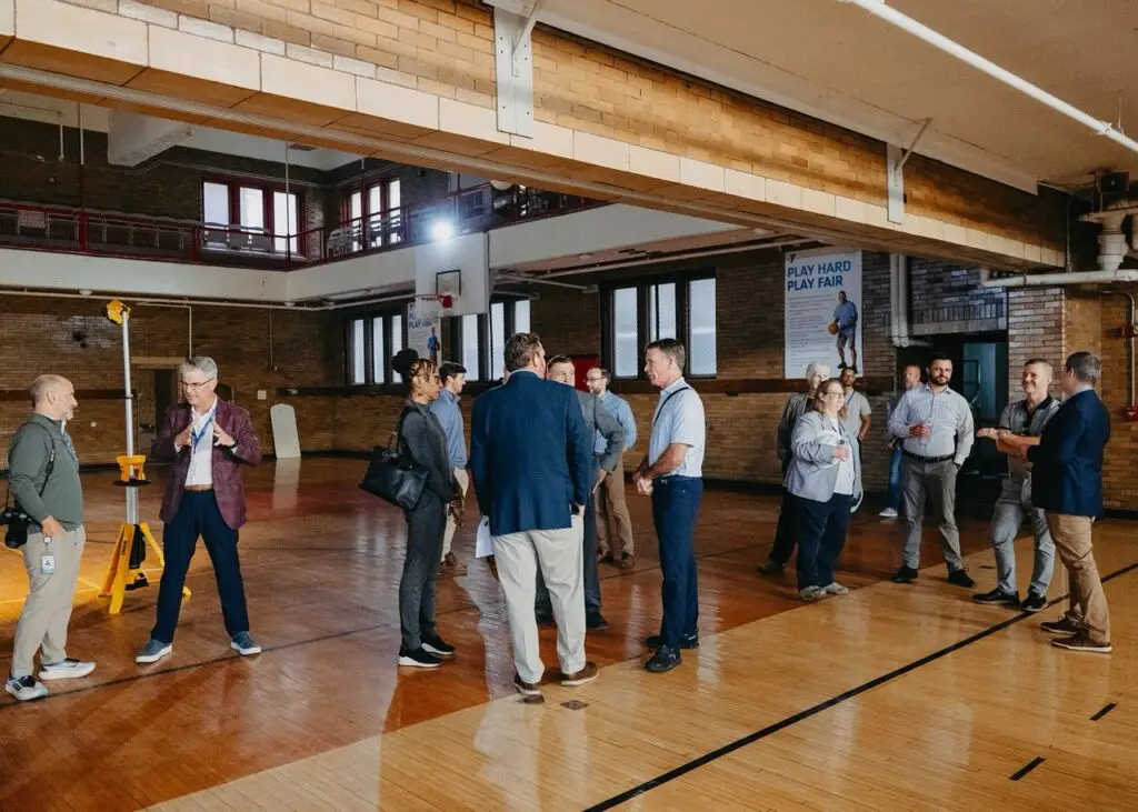 The building’s former gym has two full-sized basketball courts. One will be maintained for resident free play use, and the other will be converted into an indoor play area. In addition, there will be a community room with a kitchenette, a fitness room, bike storage, a pet care/wash room, a package room, and co-working space.